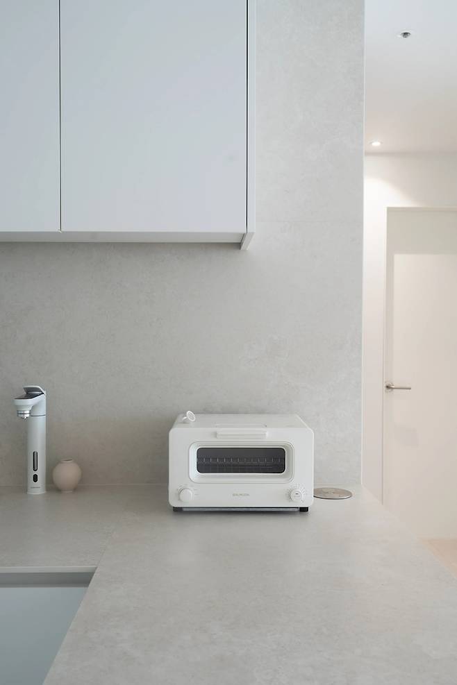 싱크대 오른편에는 죽은 빵도 살려낸다는 발뮤다 토스터기를 두었어요. 토스터기 덕분에 맛있는 빵을 주말 아침마다 챙겨먹고 있네요.(늘어나는 살은 덤..)
