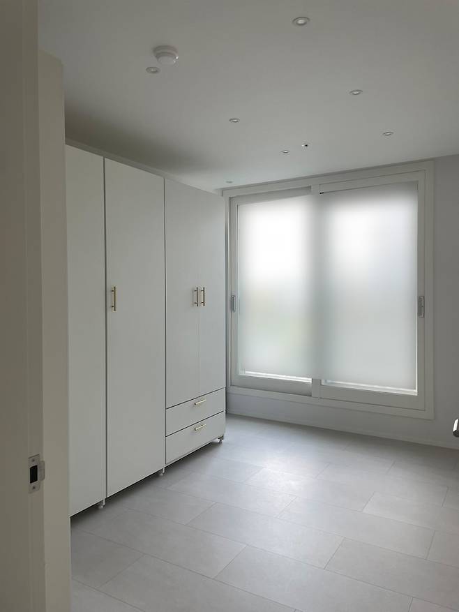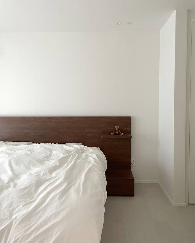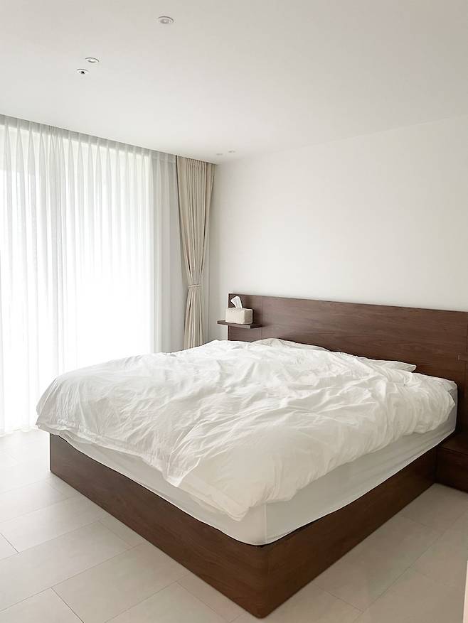 꼭 호텔에 온 것 같죠? 원래 남편이랑 저는 TV를 많이 안보는 편이었는데, TV를 안방에 설치했더니 정말 자주 보고 있어요. 소파보단 침대가 더 편해서 그런가 봐요ㅎㅎ 좋아하는 영화를 보다 잠드는 날도 많아졌어요.