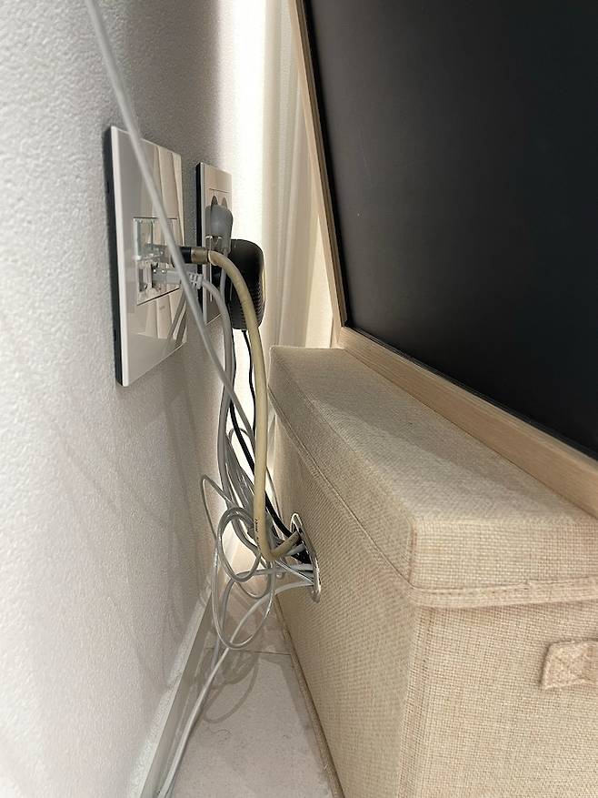반매립 공사를 한 게 아니라서 셋톱 박스와 공유기 등의 선들을 어떻게 감출까 고민을 많이 했어요. 보통은 수납 스툴 같은 걸 놓고 가리시던데, 저는 제가 가지고 있던 리빙 박스를 활용했어요!