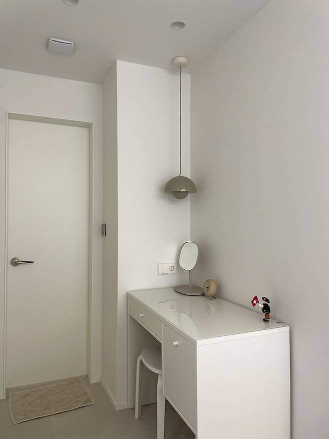화장대를 딱 들어맞게 맞춤 제작을 할까 생각도 했는데, 원래 쓰고 있던 이케아 화장대를 가지고 왔더니 찰떡인 거에요! 수납도 잘 되어있는 화장대라 정말 잘 쓰고 있어요.