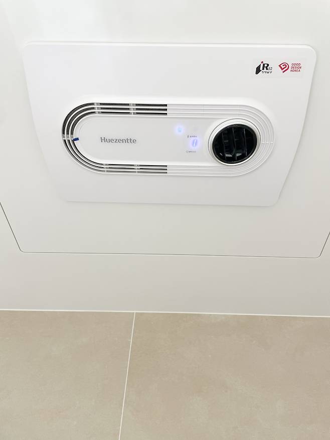 휴젠뜨 환풍기를 설치했어요. 휴젠트 환풍기는 환기 뿐만 아니라 온풍, 건조, 드라이 기능을 가지고 있어요. 화장실의 물기를 빠르게 날릴 수 있고 겨울에는 온풍기로 따뜻하게 사용할 수 있어요.