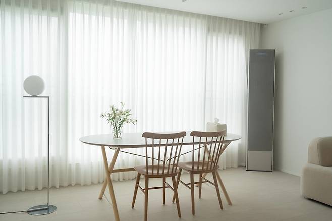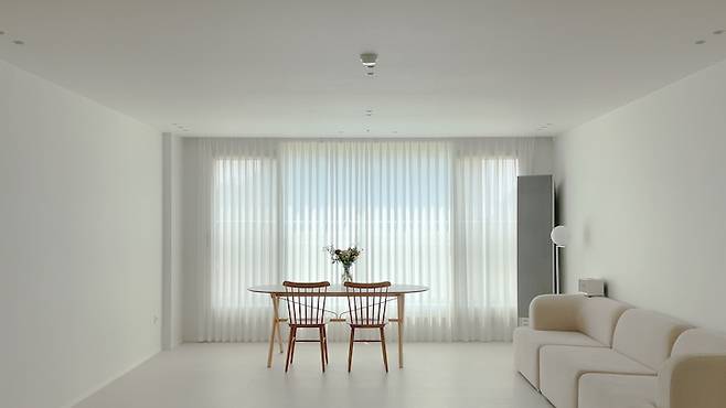 소파 반대편 벽에는 원래 삼성 더 프레임 벽걸이 TV를 설치할 계획이었어요. 그런데, 공사할 때 보니 조적벽인 거 있죠. 조적벽에 75인치 TV를 달기는 조금 불안하고, 그렇다고 소파의 위치를 바꾸고 싶진 않았어요. 그래서 과감하게 TV 없는 거실을 만들었답니다. 테이블을 옮겨가며 쓰임에 맞게 다이닝 공간으로 사용하고 있어요.
