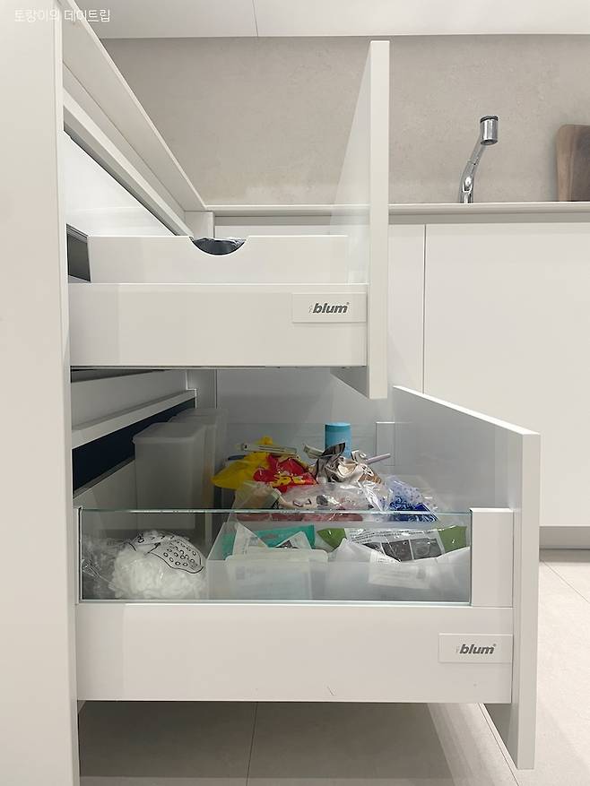 서랍 하드웨어도 정해야 하더라구요..? 서랍 레일이 다 똑같은 줄 알았는데 아니었어요! 주방 사장님께서 블럼으로 넣어주셨는데 정말 부드럽게 열리고 살짝만 밀어도 부드럽게 닫혀요. 요리하면서 가장 자주 열고 닫는 서랍인데 블럼으로 하길 잘한 것 같아요.