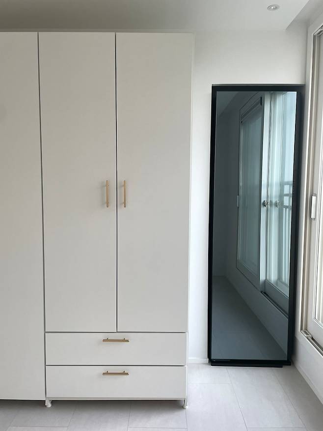 그리고 벽 끝에는 에어드레서를 빌트인처럼 넣어두었답니다. 에어드레서 3구를 사용하다가 이사오면서 5구로 바꾸었는데, 확실히 대용량이 편한 것 같아요! 겨울옷들을 이용할 때 더더욱이요:)