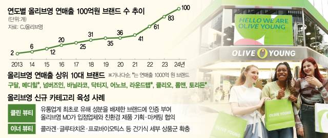 지난해 올리브영에서 100억 원 이상의 연매출을 거둔 뷰티 브랜드 수가 처음으로 100개를 기록했다.