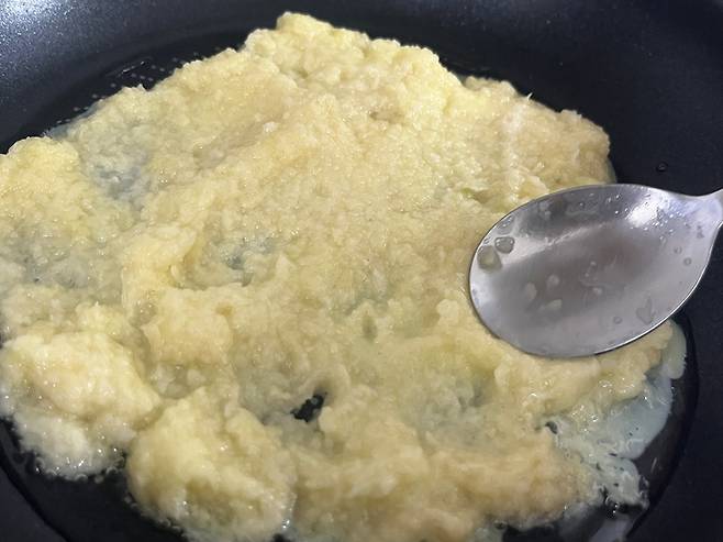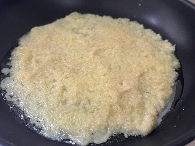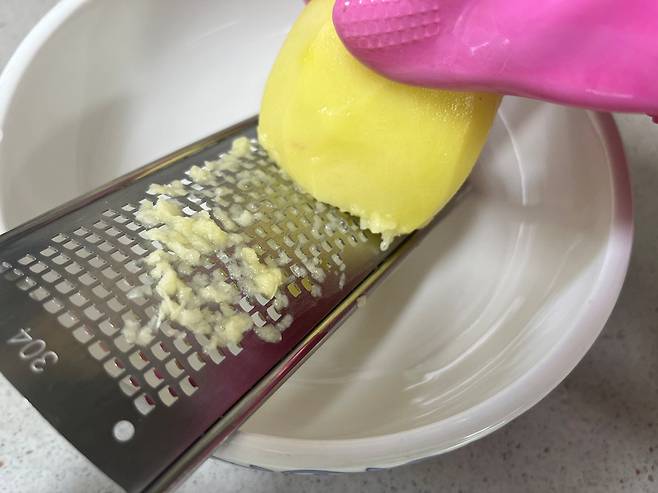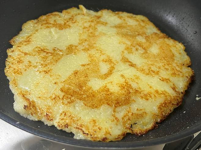 감자의 수분을 분리하고 전분만 걸러서 반죽에 넣는 레시피가 많은데, 저는 그 과정 없이 그냥 감자 간 채로 사용합니다. 이렇게 해도 충분히 맛있어요.