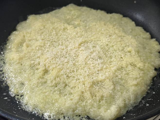 이렇게 하면 감자에 치즈의 풍미가 녹아들어 훨씬 고급스러운 맛을 낼 수 있습니다. 또한 감자전 가장자리에 치즈를 갈아 넣으면 훨씬 바삭한 식감으로 구워집니다.