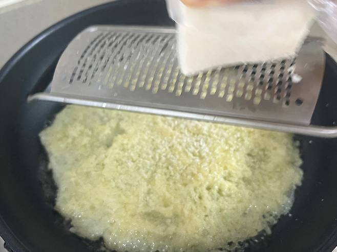 치즈를 갈아서 넣어줍니다. 저는 파르미지아노 레지아노를 썼는데 고체로 된 풍미가 좋은 치즈를 쓰시면 돼요. 치즈를 충분히 갈아서 넣어 주세요.