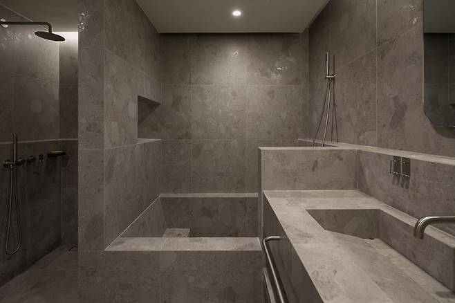 안방과 마찬가지로 매립수전 매립샤워수전 이고 타일부착 세면대