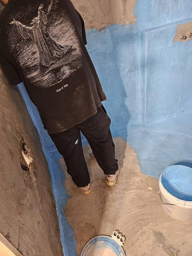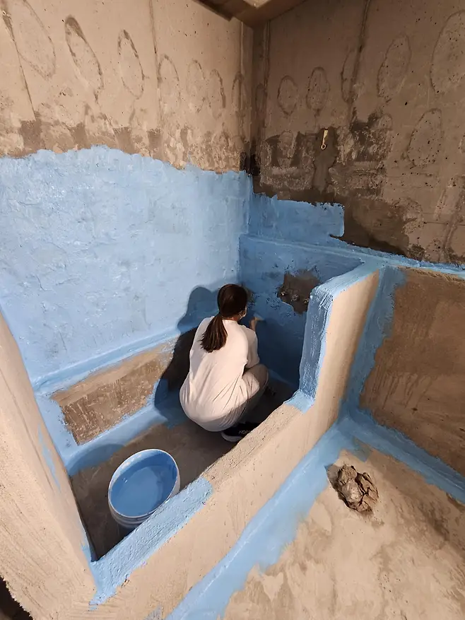 요건 몰탈방수하고 나서 나랑 와이프랑 욕조랑 화장실 방수하는사진