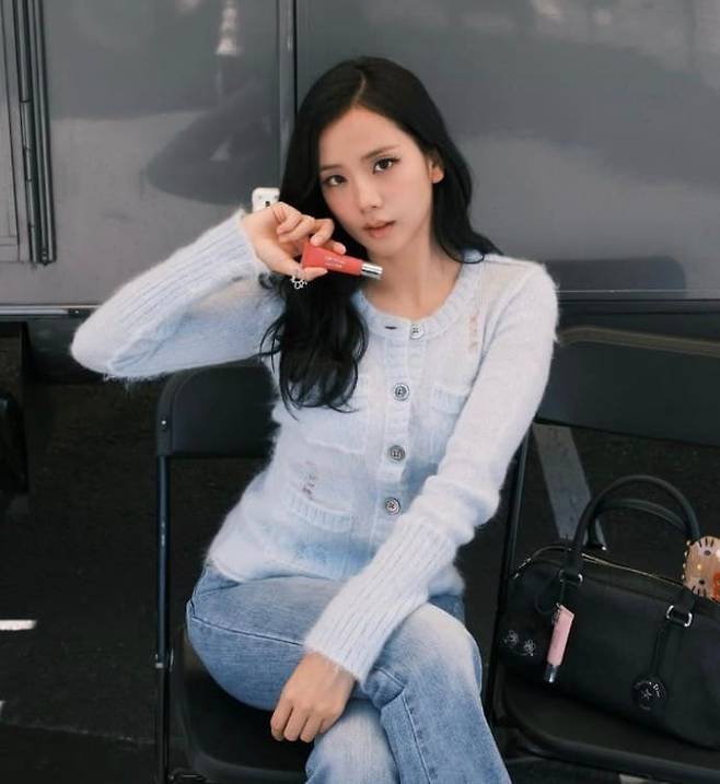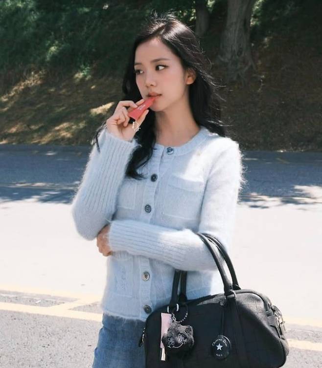 최근 공개된 사진 속 지수는 화사한 봄 날씨에 어울리는 청순한 무드의 파스텔 블루 컬러 니트 카디건과 데님 팬츠를 매치해 깔끔하면서도 세련된 봄 데일리룩을 완성했어요. 편안하고 캐주얼한 스타일이에 디올의 블랙 핸드백과 함께 매치해 포인트를 주었답니다.