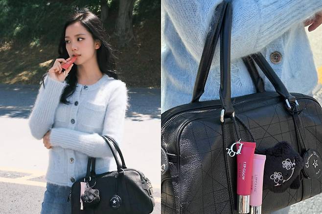 특히 봄처럼 화사한 컬러의 립 제품을 가방에 달아 가방 꾸미기와 동시에 메이크업 수정도 쉽게 할 수 있는 일석이조의 센스랍니다. 지수처럼 간단한 아이템들만으로도 충분히 세련된 스타일링이 가능하다는 걸 잘 보여주는 예시죠.