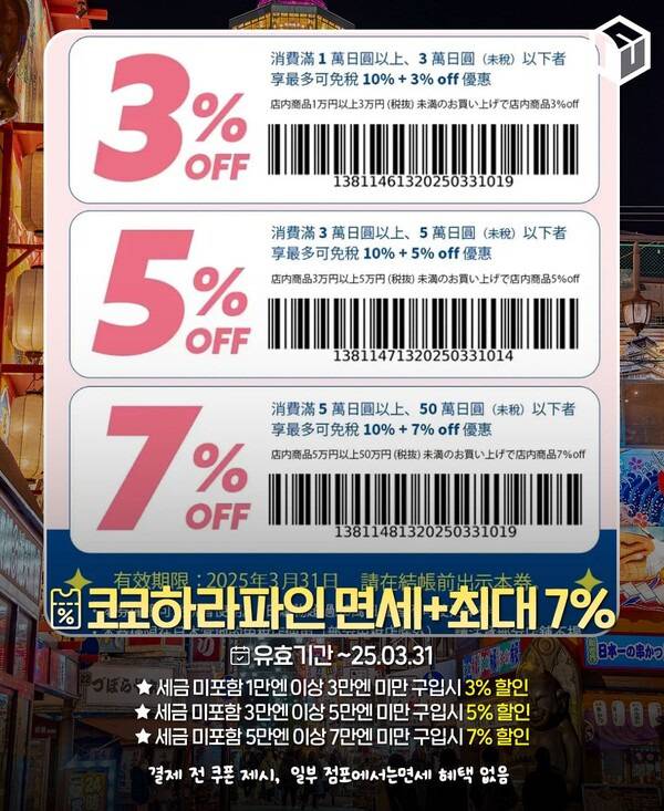 코코하라파인에서는 기본적으로 면세를 받을 수 있죠. 세금 미포함 1만엔~3만엔 미만 구입시 3%가 추가 할인되며 3만엔~5만엔 미만 구입시 5%, 5만엔~7만엔 미만 구입시 7%가 추가로 할인됩니다.