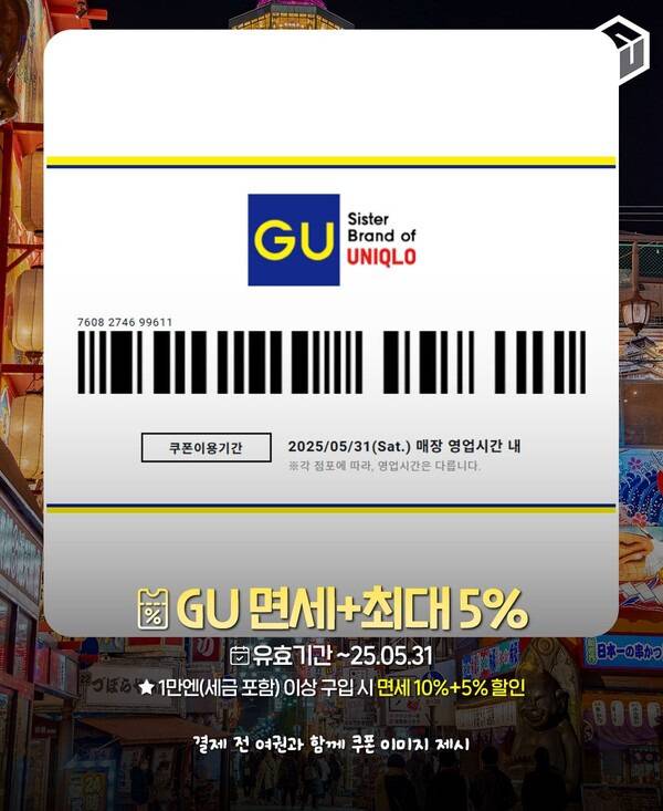일본 의류 브랜드 GU의 할인쿠폰입니다. 2025년 5월 31일까지 사용가능한 쿠폰이며 1만엔 이상 구입시 면세와 함께 5% 할인 혜택이 적용됩니다. 결제 전 여권과 함께 위 이미지를 카운터에 제시하면 됩니다.