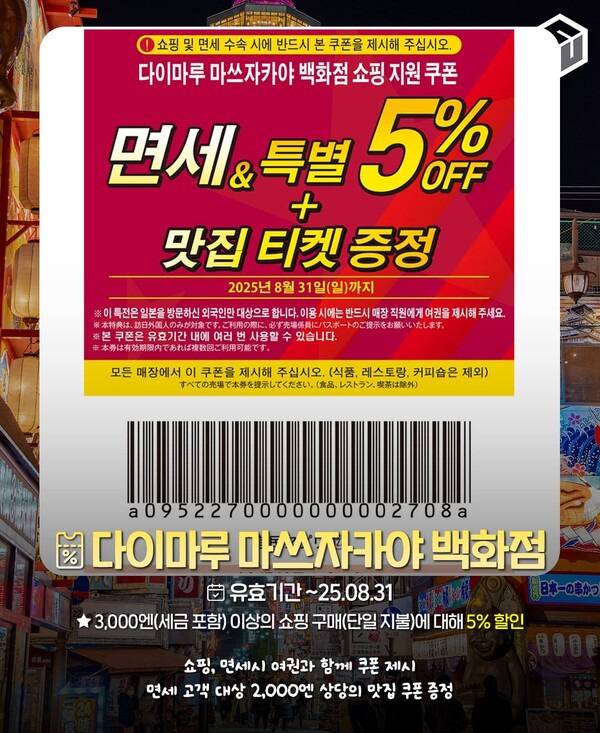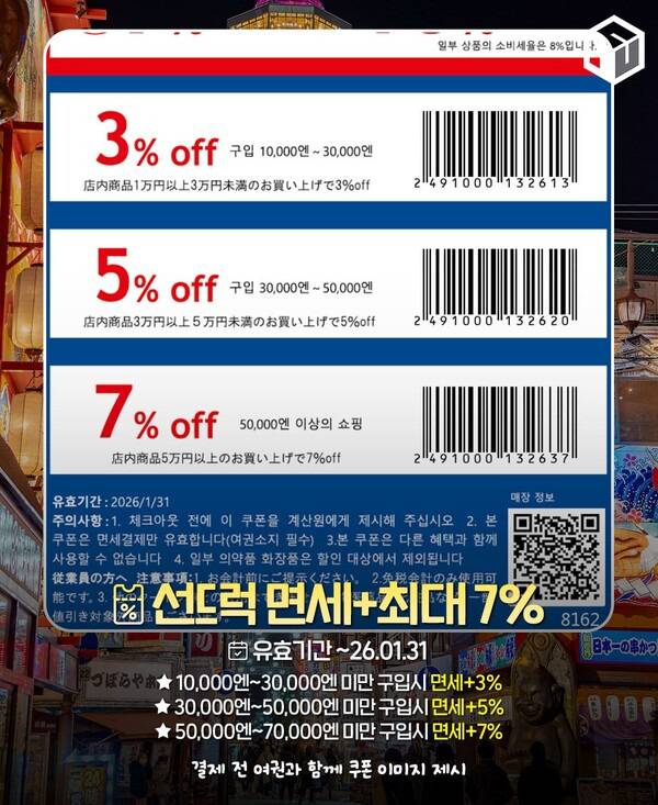 면세 혜택과 함께 5% 할인 혜택이 제공되며, 면세 고객을 대상으로 1인 1회에 한해 2,000엔 상당의 맛집 쿠폰이 증정됩니다.