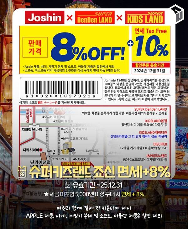 장난감과 피규어 등을 주로 판매하는 슈퍼키즈랜드, 덴덴랜드, 죠신에서 사용할 수 있는 할인쿠폰입니다. 2025년 한 해동안 사용이 가능하며, 세금 제외 5,000엔 이상 구매 시 면세와 함께 8% 할인 혜택을 받아볼 수 있습니다.