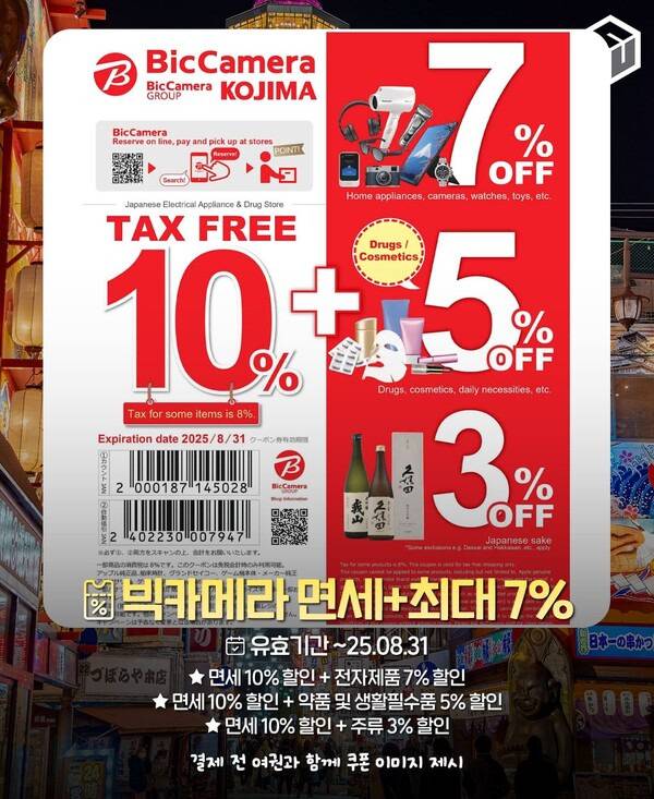 전자제품과 화장품, 주류 등을 판매하는 빅카메라 할인쿠폰입니다. 유효기간은 2025년 8월 31일까지이며 품목에 따라 할인율이 상이합니다.