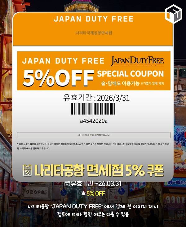 나리타공항 내 'JAPAN DUTY FREE' 면세점에서 사용할 수 있는 할인쿠폰이며, 결제 전 위 이미지를 제시하면 됩니다. 다만 점포에 따라 쿠폰 사용 여부가 다를 수 있으니, 매장에 들어가자마자 쿠폰을 사용할 수 있는지 확인해보시는 것이 좋겠죠?