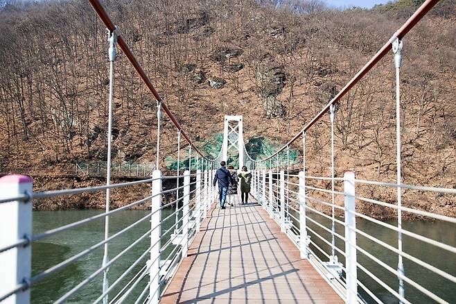 잔잔한 호수의 물결을 벗 삼아 평탄한 데크길을 걷다 보면 어느덧 첫 번째 명물인 하늘다리에 닿습니다. 호수 위를 가로지르는 이 다리를 건너면 잠시 목을 축일 수 있는 청소년수련원에 도착합니다. 국내 최장 309m, 용의 몸짓을 닮은 ‘미르 309’ 하늘다리에서 다시 약간의 언덕을 지나면 초롱길의 하이라이트인 미르 309 출렁다리가 그 웅장한 모습을 드러냅니다.