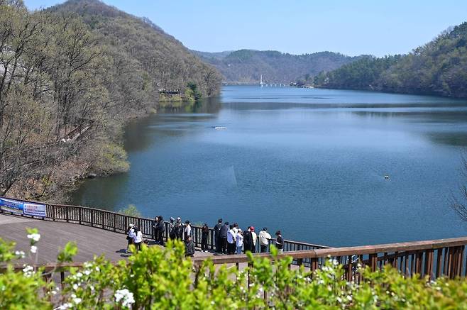 시원한 조망을 감상한 후 현대모비스 야외음악당 방향으로 내려오면 본격적인 무장애 수변 데크길이 펼쳐집니다. 길 곳곳에는 ‘생거진천 사거용인(살아서는 진천이 좋고, 죽어서는 용인이 좋다)’의 유래가 적힌 게시판들이 있어, 걷는 재미에 인문학적 깊이를 더해줍니다.