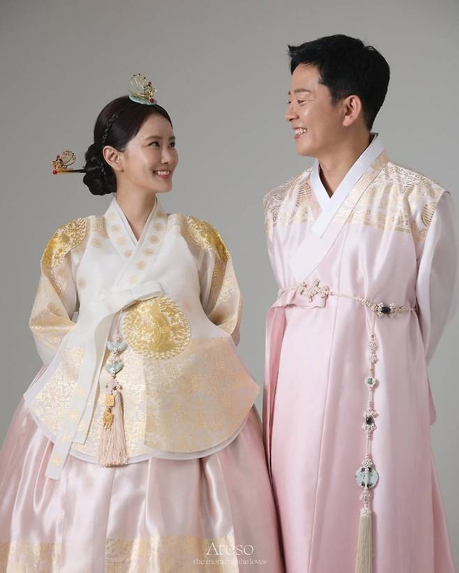 김지민과 김준호는 청아한 블루와 연보랏빛이 어우러진 고급스러운 한복 커플룩으로 한복의 미학을 극대화했습니다.