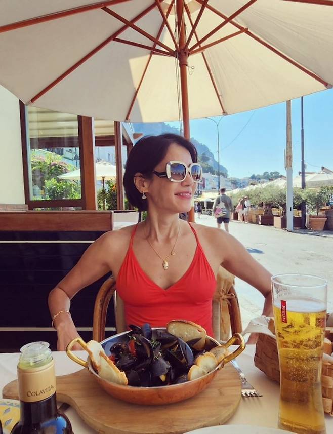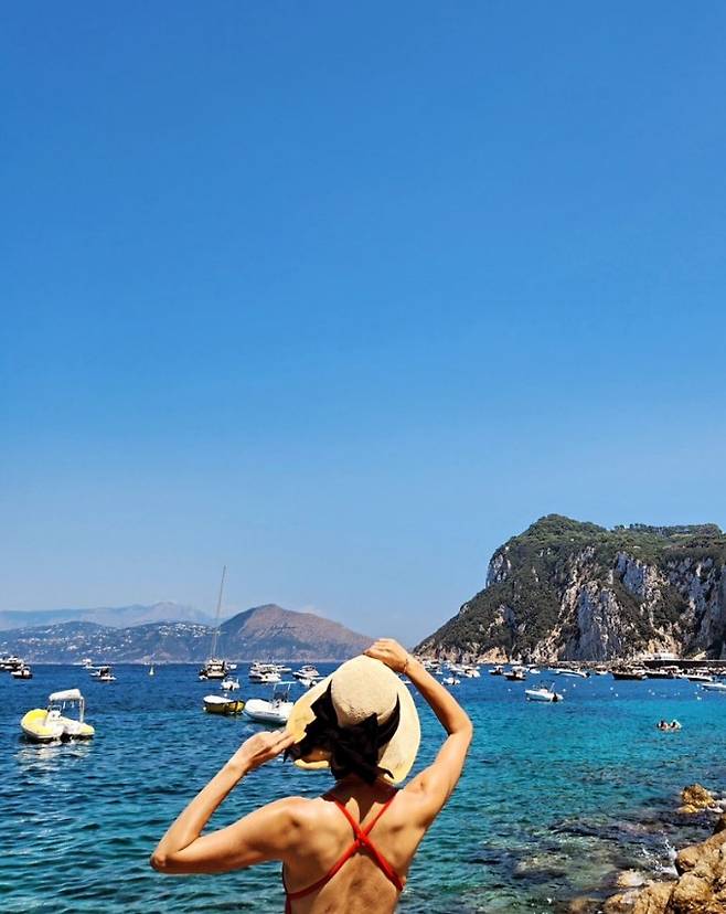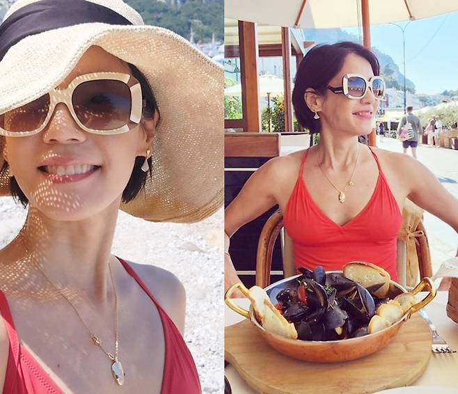 배우 김지호가 이태리 카프리에서 원피스 스윔웨어 차림으로 50대 나이가 믿기지 않는 군살 하나없는 탄탄 몸매를 뽐냈다.