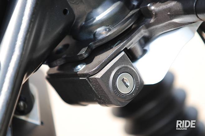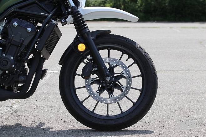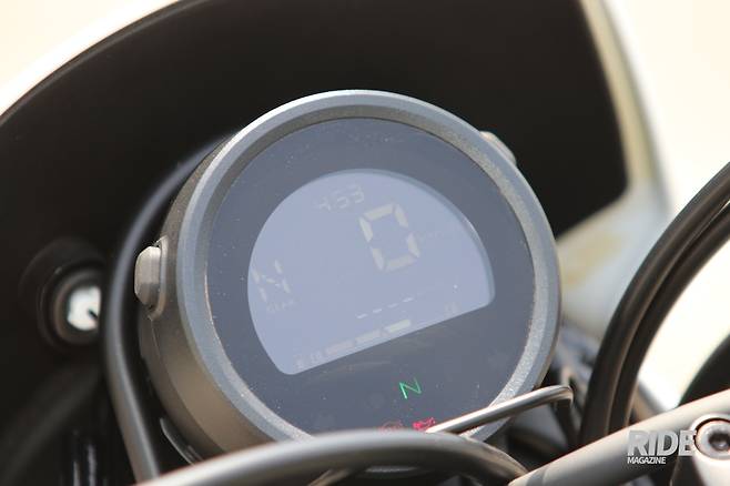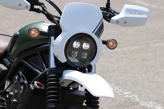 헤드라이트나 계기판 모두 디자인만 클래식일뿐, 탑재된 건 현대식이다. 헤드라이트는 LED 방식에 주간주행등이 더해졌으며, 계기판은 흑백 LCD로 주행에 필요한 정보들을 우선순위에 따라 크기를 달리해 표시한다. 그리고 보통 계기판 아래로 키박스가 보여야 하는데, CL500은 좌측면 연료탱크 아래에서 찾을 수 있다. 여기에선 시동을 켜고 끄는 것만 가능하고, 핸들을 잠그려면 핸들을 좌측으로 틀면 앞 포크 우측면에서 잠금용 키박스를 볼 수 있다. 이렇게 핸들락을 분리한 방식은 일부 아메리칸이나 꽤 오래된 모델에서나 볼 수 있던 것이어서 추억이 되살아나는 느낌이다.