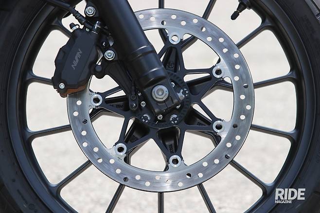 브레이크는 앞뒤 모두 디스크에 앞 2피스톤 캘리퍼, 뒤 1피스톤 캘리퍼 구성으로, 차체가 그리 무겁지 않아 이 정도만으로도 충분히 원하는 곳에 멈춰 세울 수 있을 정도의 제동력을 보여주고, 여기에 2채널 ABS로 안정성을 더했다. 또한 급제동 시 안전을 위해 후방 차량에 경고를 보내는 긴급 제동 신호(ESS) 기능도 갖췄다. 어시스트/슬리퍼 클러치는 시내나 교외 모두에서 빛을 발하는 기능으로, 시내에서는 클러치 레버의 조작을 가볍게 하기 때문에 가다서다를 반복하는 상황에서도 손의 피로를 줄여주고, 교외에서는 하단 변속 시 백 토크를 줄여 뒷바퀴가 튀는 현상을 억제하기 때문에 코너 진입 전 차체가 안정된 상태로 적극적인 엔진 브레이크 활용이 가능하고, 코너를 빠져나올 때는 보다 빠른 탈출 가속이 가능하다는 장점이 있다. 없어도 괜찮지 않냐고 생각하겠지만, 엔진 회전수가 높을 때 하단 변속을 하고 클러치를 바로 연결해 뒷바퀴 쪽이 불안해지는 경험을 한 번이라도 해봤다면 어시스트/슬리퍼 클러치가 얼마나 유용한지 알 수 있을 것이다.