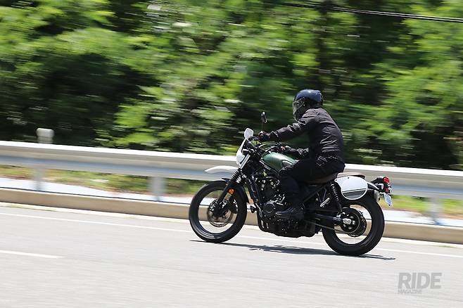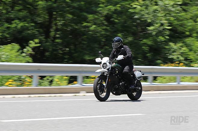 외관은 보편적인 스크램블러의 공식을 잘 따르고 있는 모습이다. 우선 클래식한 스타일의 원형 헤드라이트와 계기판, 사이드미러, 날렵하게 다듬어낸 연료탱크, 높게 장착한 머플러와 너클가드, 앞바퀴를 길게 덮은 펜더 등 필요한 요소를 두루 갖추고 있다. 다만 실제 사용 비중은 오프로드보단 온로드가 훨씬 많은 만큼 휠은 캐스트휠로, 타이어도 비포장길 정도에나 적합한 온로드 비중이 높은 타이어를 장착해 실용성을 강조했다. 시트는 앞뒤가 일자로 연결된 방식인데, 개인적으로는 키가 좀 큰 편이라 포지션을 자유롭게 가져갈 수 있는 점이 마음에 들었다. 다만 시트고가 820mm로 제법 높아 키가 작은 사람이라면 좀 부담스러울 수도 있겠지만, 차량 무게가 195kg으로 가벼워 그렇게까지 다루기 어렵진 않을 것이다.