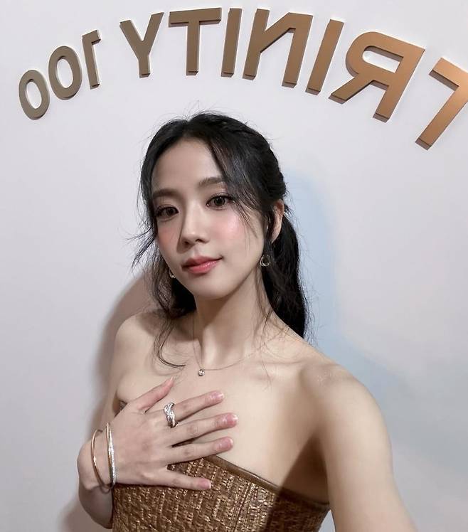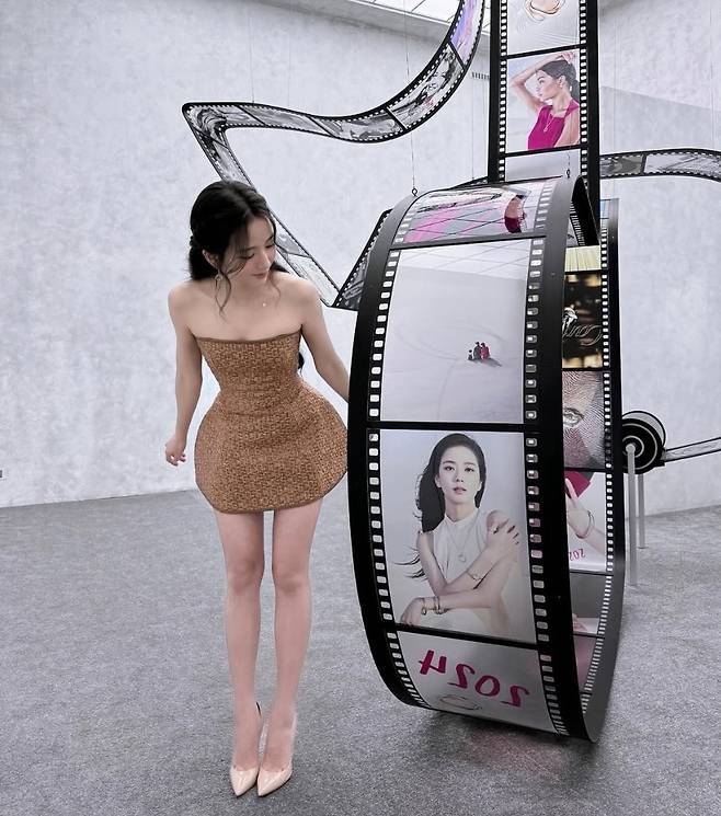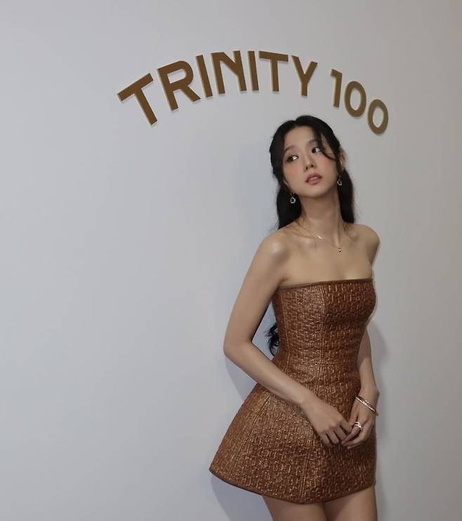지수는 독특한 텍스처가 돋보이는 브라운 튜브탑 미니드레스를 착용하고 고혹적인 매력을 발산했습니다.
