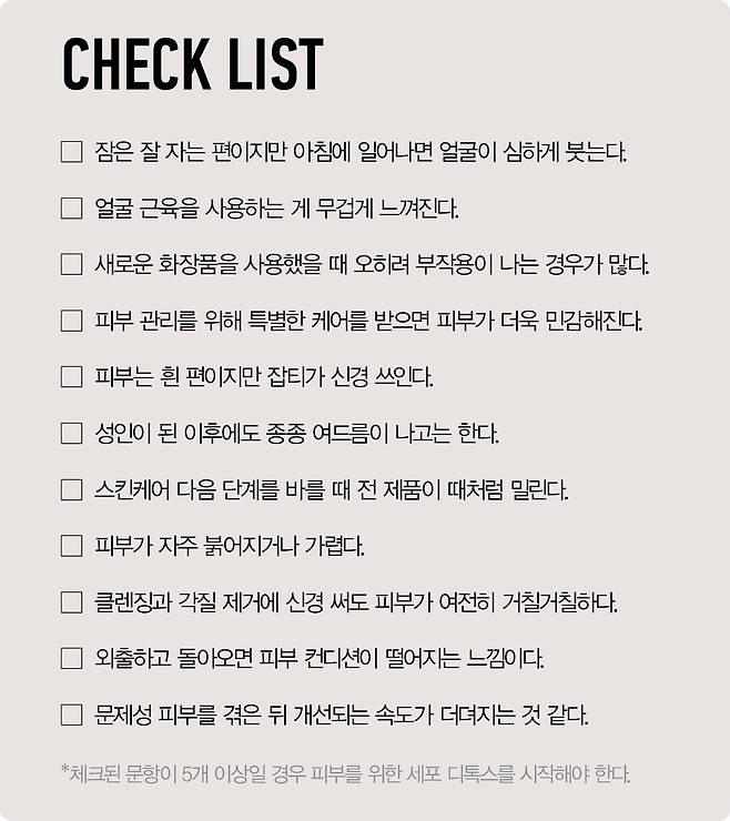 세포에 독소나 활성산소가 축적되면 DNA, 세포막, 미토콘드리아까지 손상되는데, 말미엔 세포 기능이 저하하거나 상실되기도 한다. 세포 기능이 망가지면 피부 면역 시스템을 관리하는 랑게르한스 세포의 수가 현저히 감소한다. 랑게르한스 세포는 피부의 가장 강력한 항원 전달세포로 접촉 과민 반응에 중요한 역할을 하는데, 이 세포 수가 감소하면 곧 피부 장벽 손상과 피부 재생 능력도 떨어진다. 피부 염증이나 여드름, 색소침착 같은 문제적 피부 질환을 일으키고 만성 피부 질환을 유발하기도 한다. 이럴 때 필요한 방법이 바로 ‘세포 디톡스’다. 피부 세포 본연의 자가 재생력과 자가 회복력을 키울 수 있는 방법이며, 면역 시스템을 향상시키는 가장 쉬운 길이 디톡스기 때문. 여기서 말하는 세포 디톡스는 단순히 사용하는 제품의 양이나 개수, 빈도를 줄여야 한다는 뜻이 아니다. 클린 주스와 절식, 산림욕만을 의미하는 건 더더욱 아니다. ‘생체 내 세포에서 유독한 물질을 무독한 물질로 바꾸는 일, 즉 생체가 작용이 적은 구조나 배설되기 쉬운 구조로 바꾸는 일정한 생화학 반응’이라는 디톡스의 사전적 의미와 가깝다. 오물과 쓰레기로 뒤덮인 집 안에 공기청정기와 디퓨저를 놓는다고 해서 오물과 쓰레기가 깨끗하게 사라지진 않는 것처럼, 세포 디톡스를 통해 독성 가득한 세포를 정화하고 세포의 기능 향상을 위해 근본적으로 청소하자는 의미다.