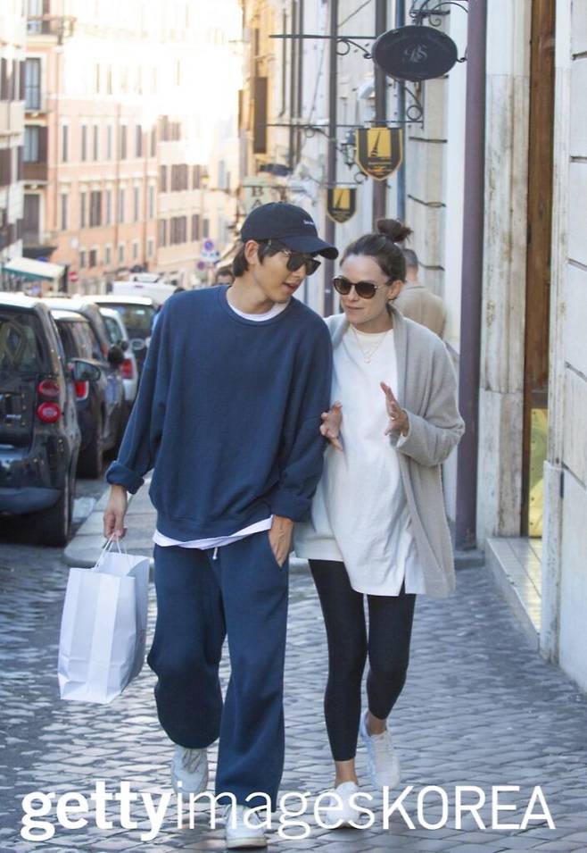 서울 용산구 한남동 일대에서 찍힌 이 사진은 16일에 올라온 것으로 여유롭게 산책하고 있는 송중기와 케이티 루이스 사운더스의 모습이 담겼다.