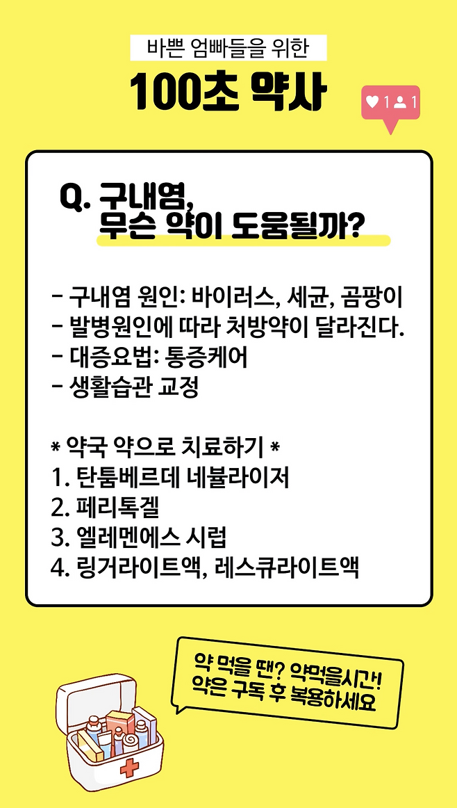 구내염은 주로 바이러스, 세균, 곰팡이에 의해 생기는 질환인데 같은 구내염이라도 발병원인에 따라 처방약이 달라질 수 있어요.