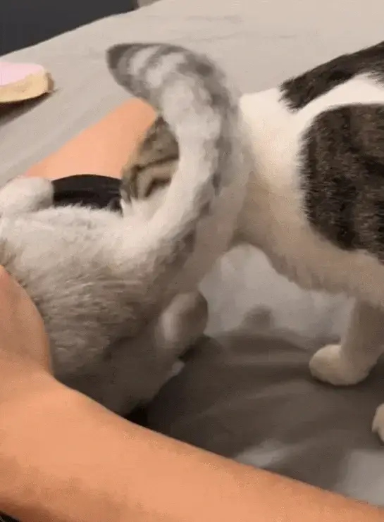 처음에는 둘째 고양이가 형의 혀 마사지를 억지로 참고 받아주었는데, 어느 날 드디어 반격의 기회를 잡았습니다. 형이 다시 한번 열심히 핥고 있을 때, 둘째가 갑자기 "뿌우욱!" 하는 생화학 공격을 감행했습니다.