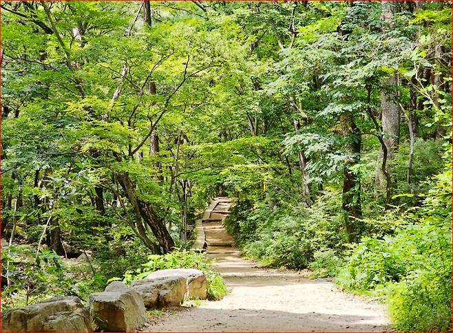 계곡길은 등산이라기보다 ‘산책’에 가까울 정도로 무난한 코스로 조성되어 있어요.어린이부터 어르신까지 함께 걷기 좋으며, 특히 무더운 여름에도 숲이 만든 그늘 덕분에 선선한 기운이 가득합니다. 폭포와 계곡이 만들어내는 시원한 풍경 덕분에 가족 여름 나들이 코스로도 인기가 높죠.