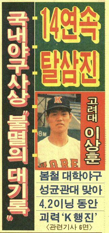 『국내 야구사상 초유의 14연속타자 탈삼진 기록이 수립됐다. 고려대의 4학년 좌완 이상훈은 9일 전국 대학야구 봄철대회 4일째 C조 경기에서 성균관대를 맞아 14명의 타자를 내리 삼진아웃시키는 대기록의 주인공이 됐다.』 <1992년 4월 10일자 스포츠서울>