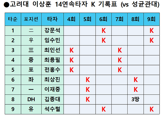 ◆고대 4학년 이상훈 14연속타자 K…한국야구사 신기록
