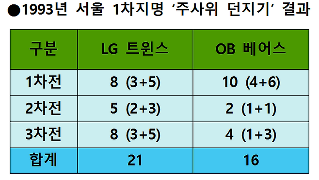 첫 번째 주사위 던지기(1차전)에서 OB가 10-8로 이겼다. LG가 3점과 5점, OB가 4점과 6점을 얻은 것. OB 측 관계자들의 박수와 환호성이 터졌다. 마치 선취점에 성공한 팀처럼, OB는 모처럼 승리할 수 있다는 자신감을 얻었다.