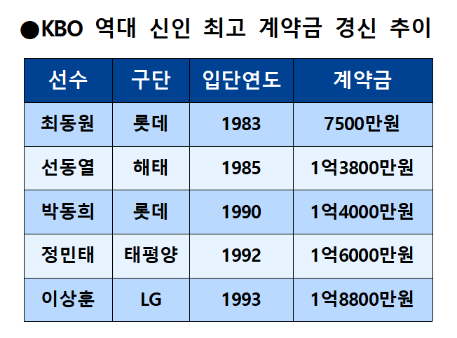 이로써 KBO 역사에 신인 몸값 2억 원의 시대가 열렸다.