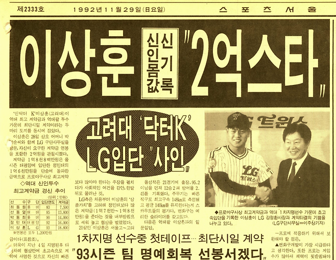 『올 시즌 대학 졸업 신인 중 최고의 투수로 꼽히는 이상훈(고려대 좌완)이 28일 프로야구 사상 최고액인 2억 원을 받고 LG와 입단계약을 체결했다. 지난해 정민태(태평양)의 신인 최고 입단액(1억7200만 원)을 2천8백만 원 경신했다.』 <1992년 11월 28일자 동아일보>