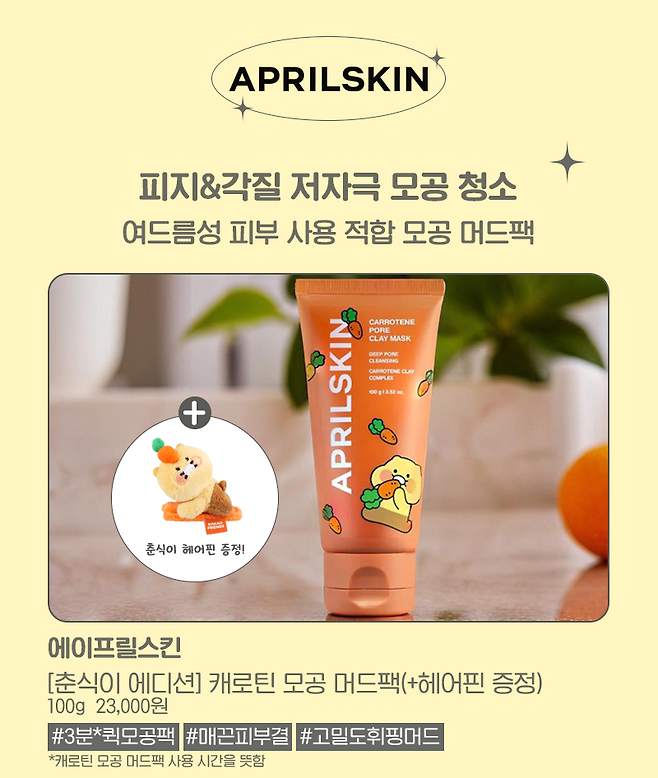 이 제품은 에디터가 평소에 가장 즐겨 사용하는 팩이기도 한데 이번에 춘식이랑 콜라보를 했더라고? 게다가 너무 귀여운 춘식이 헤어핀까지 증정해 준다고 하니~ 그것만으로도 이미 살 이유는 충분하지?