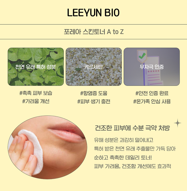 이 제품은 천연 유래 추출물을 포함하는 피부 보습 및 가려움증 특허 성분을 받은 제품이야. 그만큼 건조함을 잡아주는 것은 물론, 가려움과 피부질환 개선에 탁월하고 피부에 촉촉한 생기를 충전해 줘!