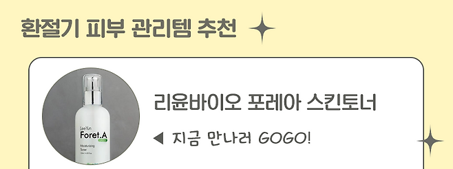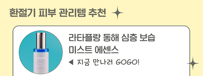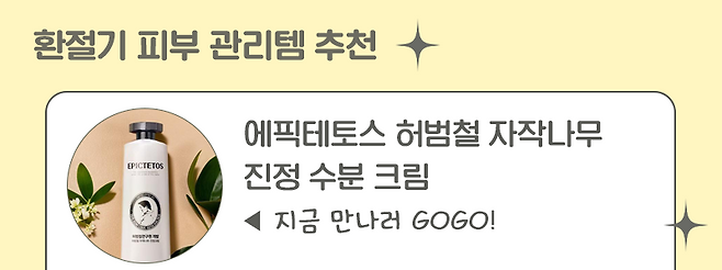 그래서 수분감과 피부 진정을 할 수 있는 영양 성분을 가득 담은 환절기 피부 관리 아이템을 사용해 주며 촉촉한 보습 케어로 환절기를 이겨내자!