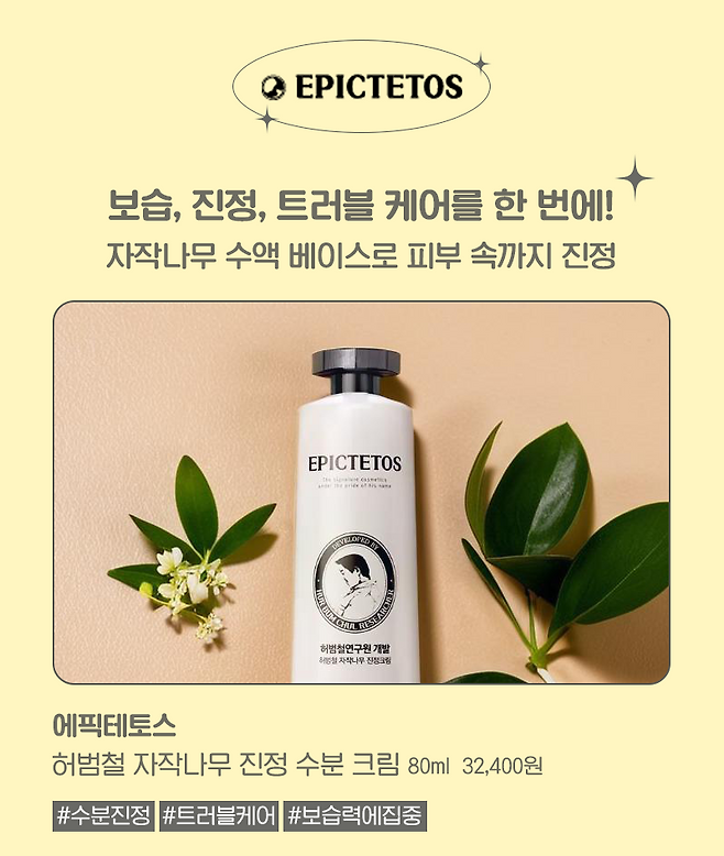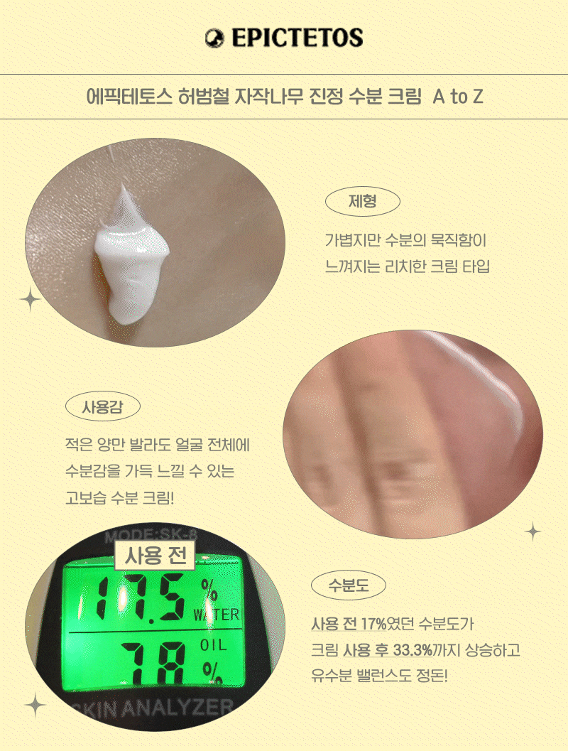 에픽테토스 수분크림은 자작나무 추출물이 아닌 자작나무 수액을 그대로 담아 적은 양만 발라도 고밀도 수분을 넉넉하게 느낄 수 있었어.