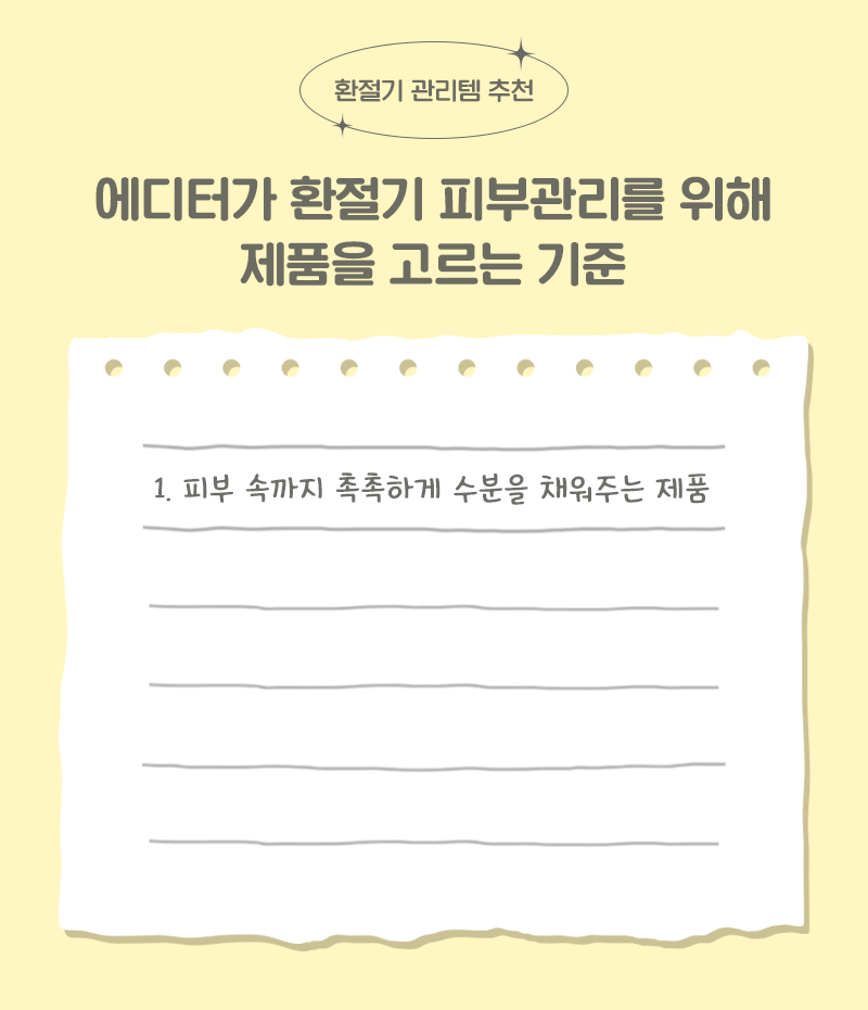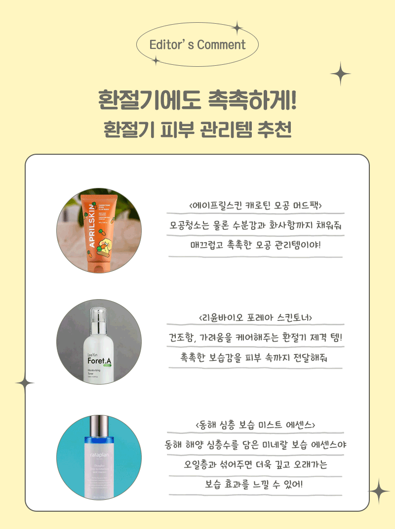 마지막으로 에디터의 환절기 피부 관리 화장품 추천 아이템 총정리를 가져왔어.