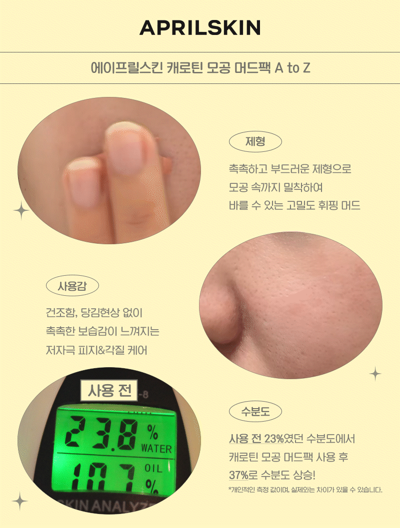 에이프릴스킨 당근 모공 머드팩은 이름에도 쓰여있는 것처럼 모공 수렴과 피지 개선에 도움을 줄 수 있는 캐로틴 성분이 들어있는 제품이야.