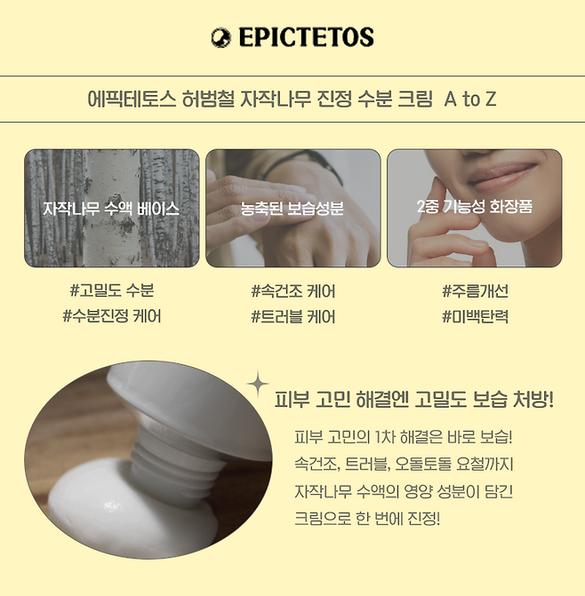 에픽테토스 수분크림은 자작나무 추출물이 아닌 자작나무 수액을 그대로 담아 적은 양만 발라도 고밀도 수분을 넉넉하게 느낄 수 있었어.