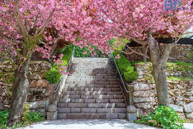 이곳에서 가장 유명한 공간은 극락계단이다. 계단 양옆으로 늘어선 겹벚꽃 나무가 하늘을 덮듯 꽃 터널을 형성해 방문객이 많이 찾는 포토존으로 알려져 있다.