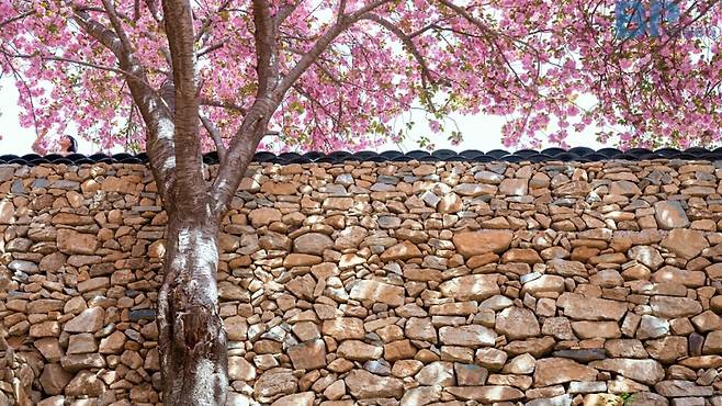 계단을 따라 올라가며 바라보는 분홍빛 꽃 풍경은 사찰 건물과 어우러져 독특한 봄 경관을 만든다.