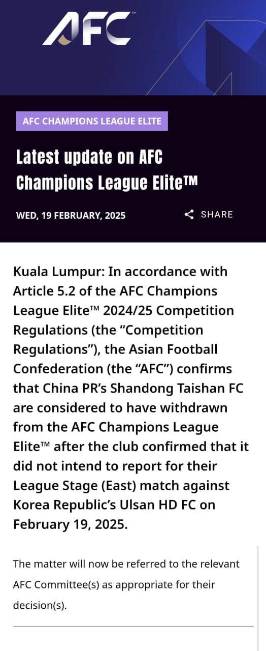아시아챔피언스리그(AFC)는 홈페이지를 통해 'ACLE 경기 규정 제5조 2항에 따라 산둥과 울산의 경기를 취소한다'고 발표했다.